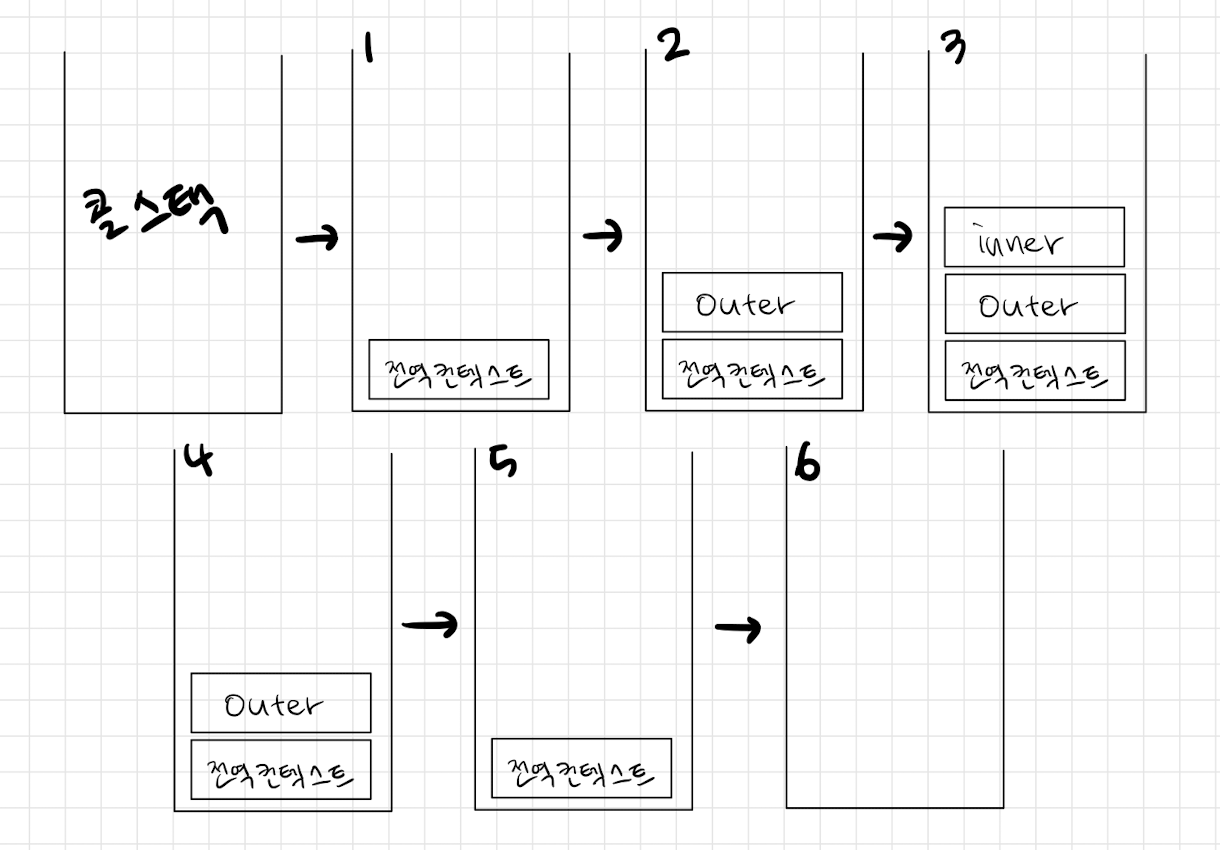 - 아래에 있던 outer 컨텍스트가 콜 스택의 맨 위에 존재하게 되므로 중단했던 (2)의 다음 줄부터 이어서 실행