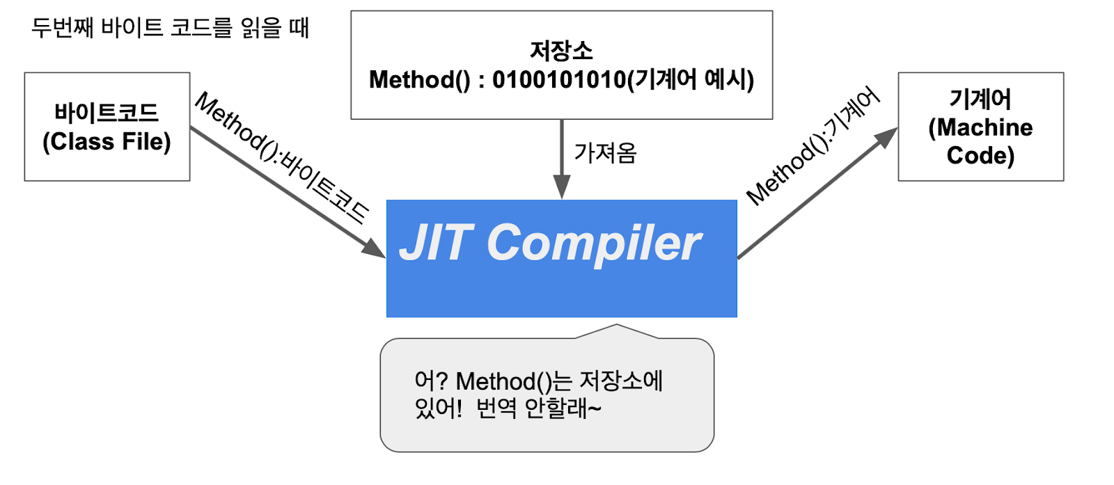 - JIT 컴파일러는 코드를 읽고 실행 중에 컴파일링을 시작하고 동시에 컴파일 된 코드를 실행함.