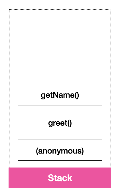 - 따라서 전체 스크립트의 실행이 시작되고 나면 먼저 익명 함수 실행이 있고 다음으로는 greet 함수가 푸시되어 스택에서 그 윗자리를 차지하는데 스택에서는 맨 위에 있는 항목이 항상 현재 실행 중인 항목이 됨