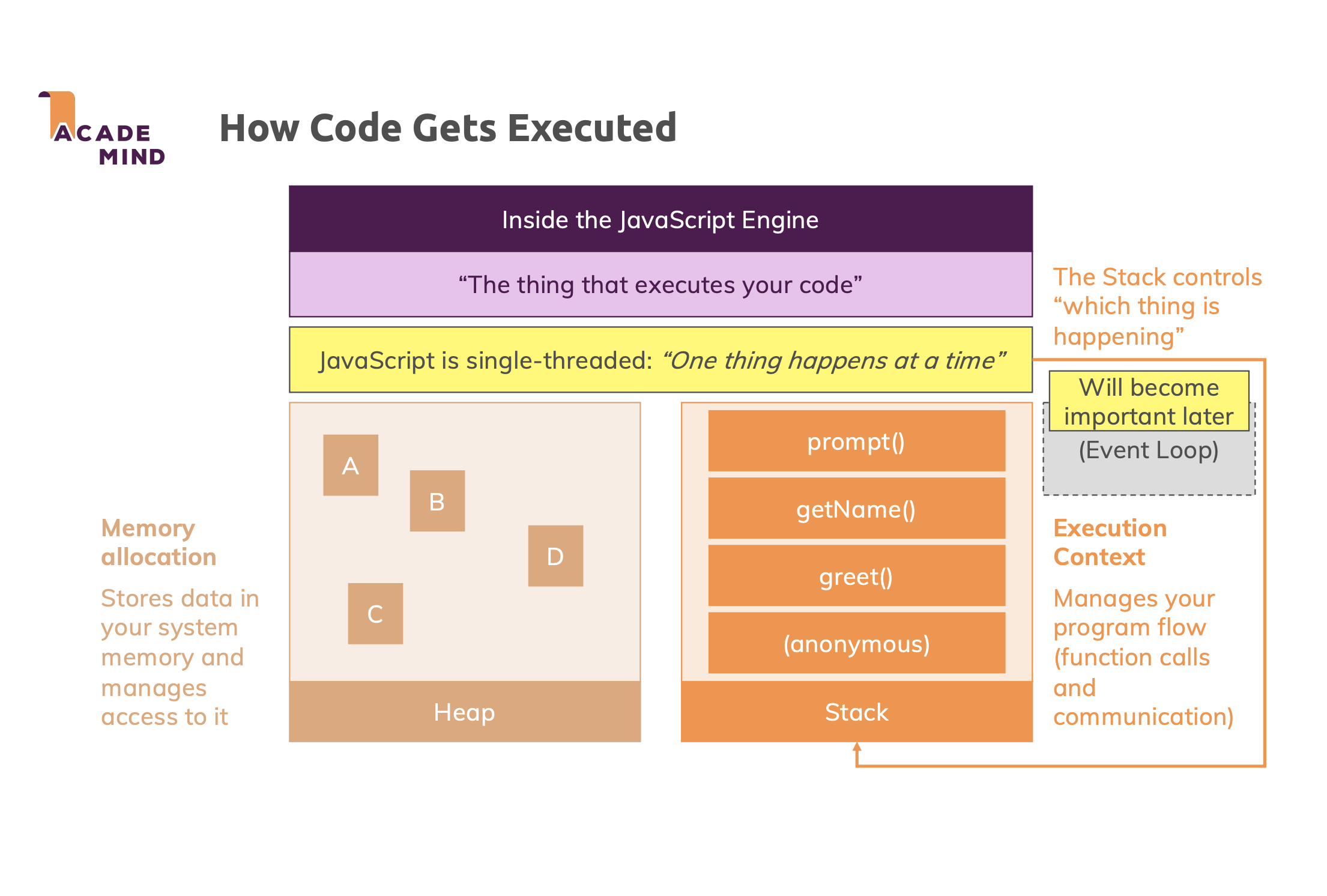 - 함수 자체는 힙에 저장됨. 브라우저가 이와 같은 함수를 저장하고, 함수가 실행될 때 코드가 실행되는 것이라고 할 수 있음.